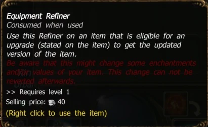 Legacy Unique Item Use this refiner on an Legacy Unique Item to get the updated version of the item on the same item level. Be aware that this might change some enchantments and/or values of your item. This change can not be reverted afterwards.