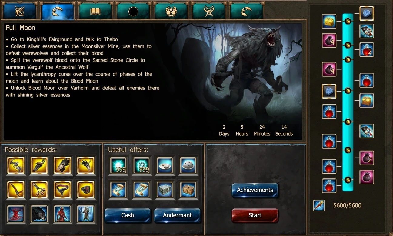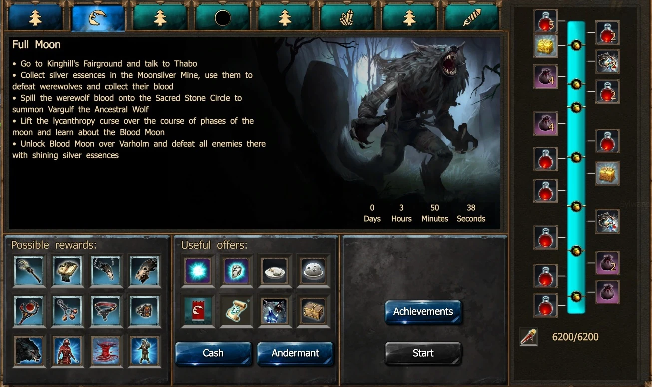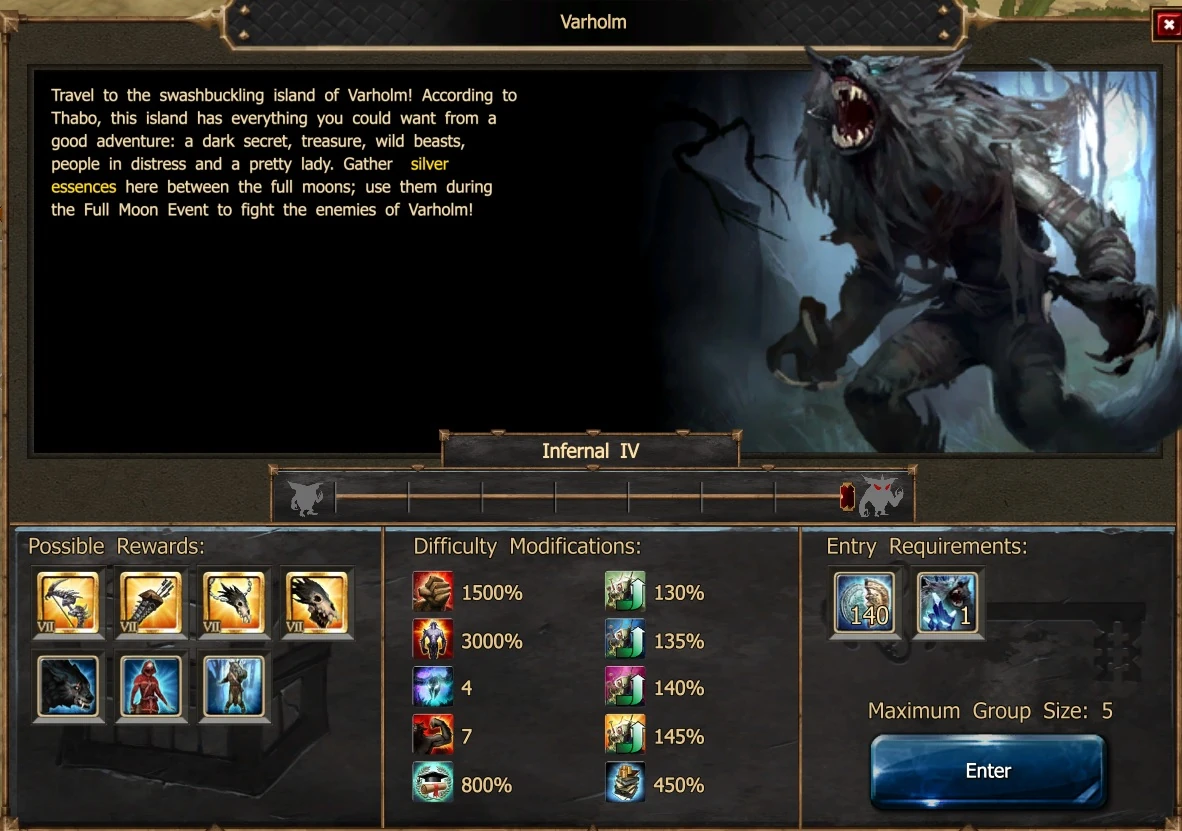 As night falls on the full moon day(s) of each month, the residents of Varholm retreat from sight and the Werewolves take control of the town. Only Shady John, Rubina and Jon Sunliar remain; the workbench is still available. Enter Varholm and you will find new creatures in-town, immune from your normal attacks. These are not your sun-light friendly, normal creatures. Now is the time to use your hard earned Silver Essences and Scrolls to defeat these monsters: