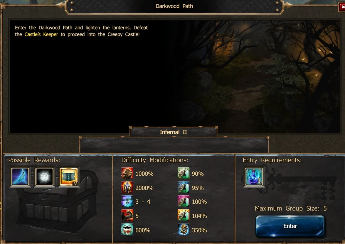 In order to proceed to the main event map Creepy Castle you will have to pass thorough Darkwood Path and kill the Castle's Keeper ... or you will have to buy