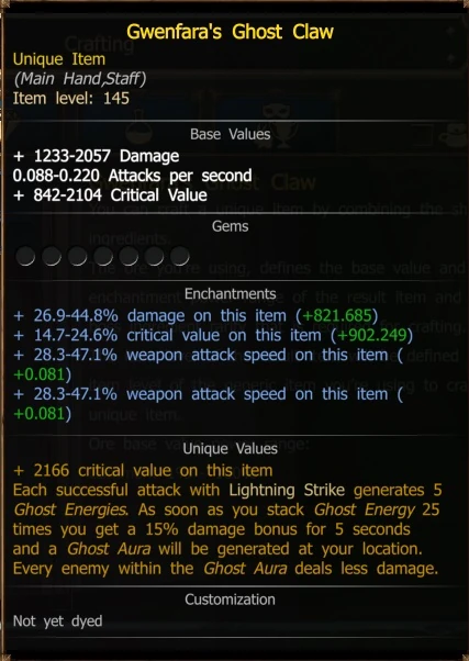 + 88-110 Damage 10,00-15,00% faster weapon attack speed 30,00-50,00% increased weapon damage Each hit with "Destruction" generates 5 Ghosty Energy. As soon as you stacked Ghost Energy 25 times you get a 25% damage bonus for 10 seconds and a Ghost Aura will be generated at your location. Every enemy within the Ghost Aura deals less damage.