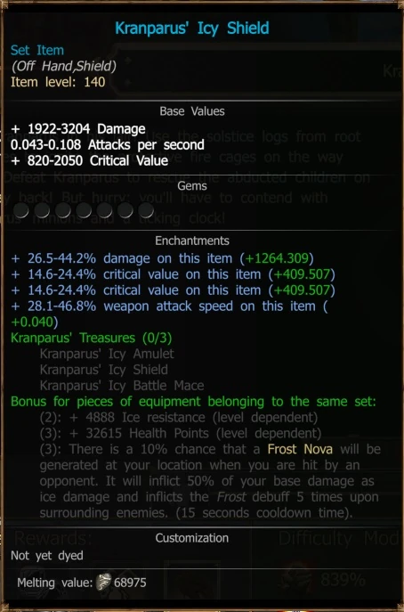 Set Bonus: (2): + 1024 Ice resistance (level dependent) (3): + 1333 Health Points (level dependent) (3): When you are hit by an opponent, there is a 5% chance that a "Frost Nova" will be generated at your location. It will inflict 20% of your base damage upon surrounding enemies and freeze them for 3 seconds (PvP: 1 second) - 30-second cooldown time.